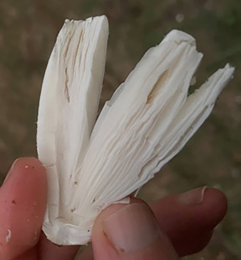 את הרגל של הפטרייה כדאי לחתוך לאורכה (איור 4) כדי לוודא שאין נגיעות. לחתוך לרוחבה לא יעזור יותר מידיי